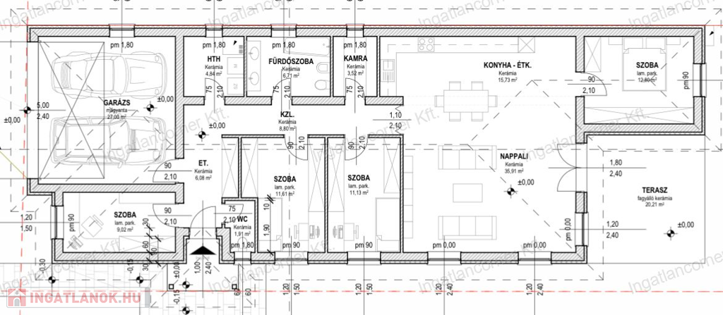 Elosztását tekintve kiváló: A hatalmas amerikai konyhás étkező-nappalin kívül, 4 hálószobával, 1 fürdőszobával, mosókonyhával, WC, kamra, rendelkeznek illetve 21 nm terasszal és 28nm garázzsal, elektromos ajtóval szerelve!