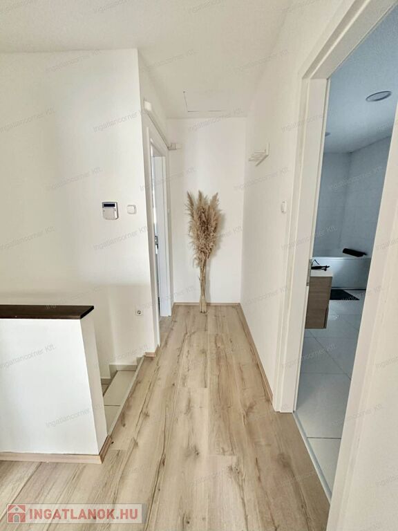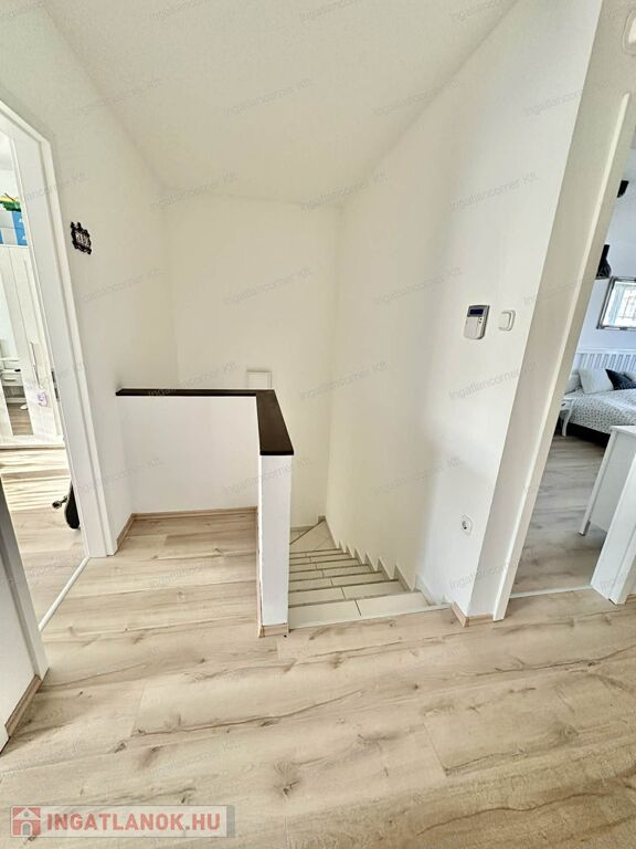 Az alsó szinten található az előszoba, zuhanyzó wc-vel, vendégszoba, konyha étkezővel, hatalmas kamra, nappali kapott helyet az alsó szinten. A nappaliból egy üvegajtón keresztül léphetünk ki a 18 nm-es teraszra, amely a hátsó kertre nyílik. A felső szinten 3 hálószoba, egy óriási méretű fürdőszoba zuhannyal és WC-vel kapott helyet. A SZOBÁK NAGYOK: 15nm, 16nm, 17nm, 18nm. A nappali – konyha – étkező összesen 48 nm. A padlástér ki lett alakítva, pakolható.