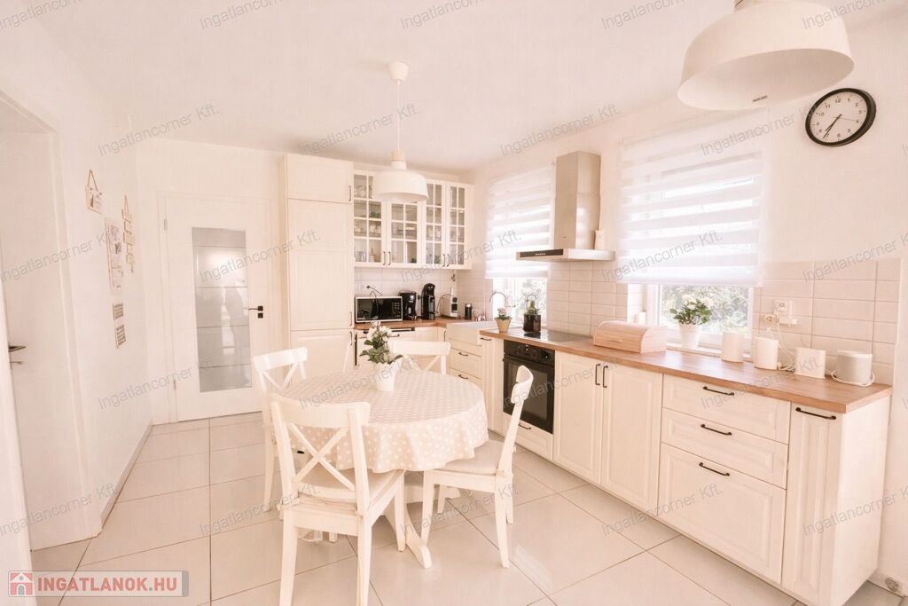 A sok méretes ablaknak köszönhetően NAGYON VILÁGOS a nappali. A konyha felszereltsége: beépített sütő -és főzőlap, beépített hűtő -és mosogatógép. A beépített konyhabútor és a hozzá tartozó teljes felszereltség a vételár részét képezik, ahogy az összes bútor is.