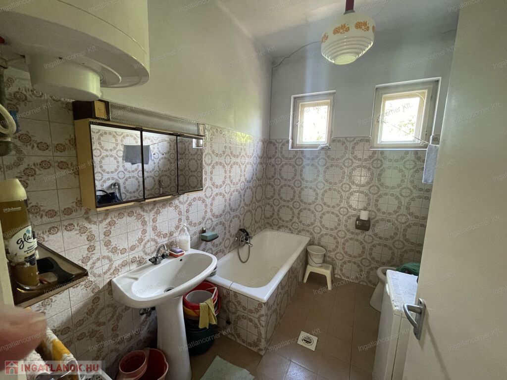 A házban 3 szoba, konyha, fürdőszoba WC-vel, előtér és kamra található. Fűtése gázkazánnal megoldott radiátorokkal. Meleg vizet villanybojler szolgáltatja. Nyílászárók dupla fatokos kivitelben. A tetőn cserép fedés van. A telken található még egy 30 m2-es tégla építésű cserép fedésű épület is. Van egy 20 m2-es terasz is és egy 20 m2-es garázs is. Villanyvezetékek rézből vannak. 3X16 Amper és vezérelt áram van. A nagy telek rendezett, locsolásra fúrt kút is rendelkezésre áll.